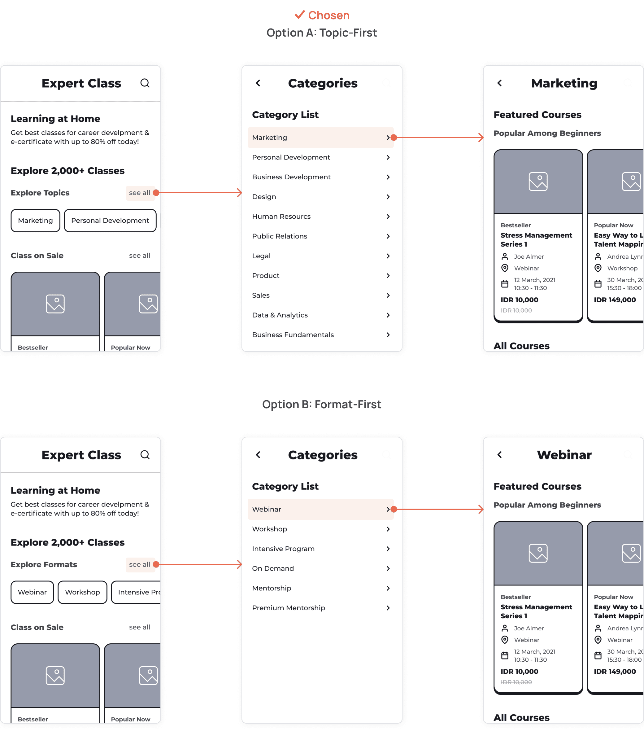 I tested two navigation prototypes with learners of varying familiarity. Topic-first emerged as the clearer, more universal option, while format-first only worked for returning learners.