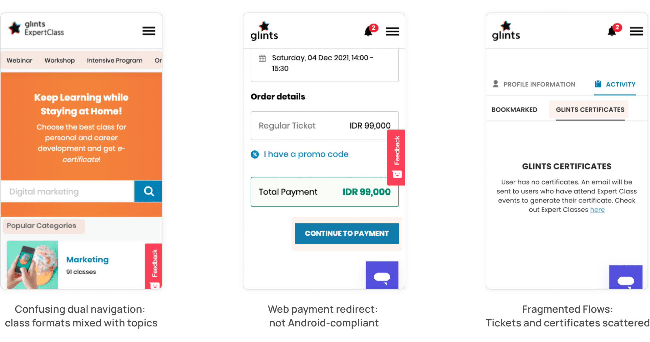ExpertClass was built for the web but needed to scale into Glints’ mobile app. I evaluated and found the mobile experience required more intuitive exploration, compliant payment flows, and cohesive journeys for new and returning learners.