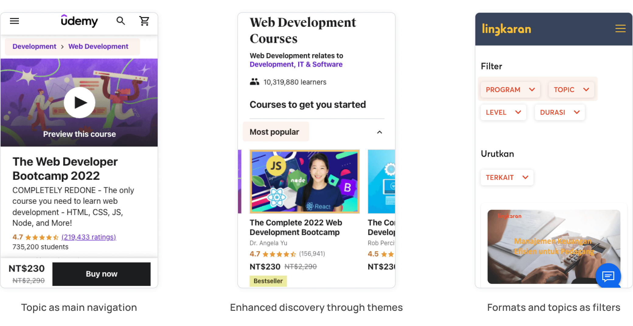 To redesign the platform navigation, I analyzed competitors who used topics as the primary entry point, supported by formats and themes as filters to enhance discovery.