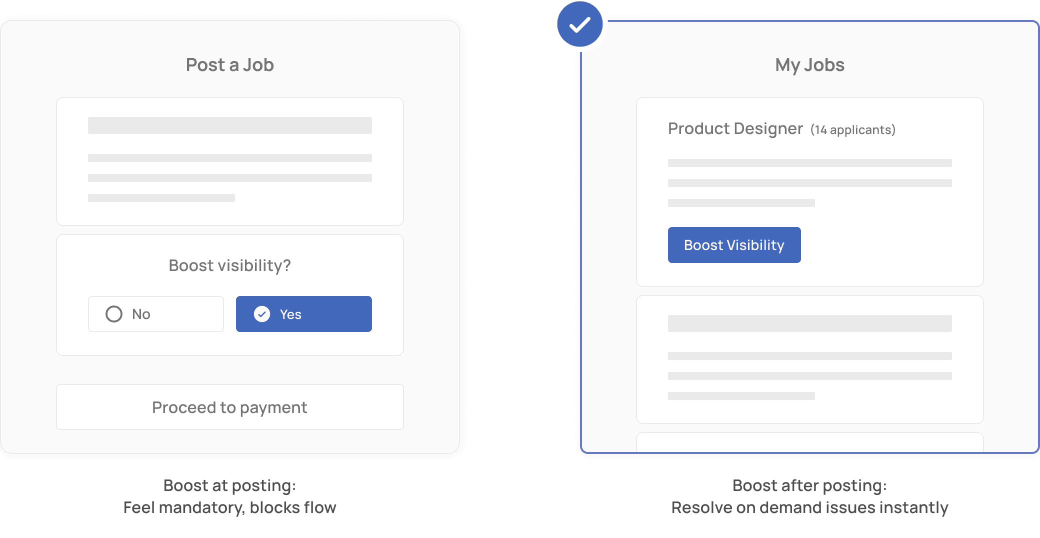 I conducted competitor analysis, framed timing trade-offs, and validated with sales: boost after posting not only reduced posting friction but also enabled instant, on-demand performance control when jobs underperformed.