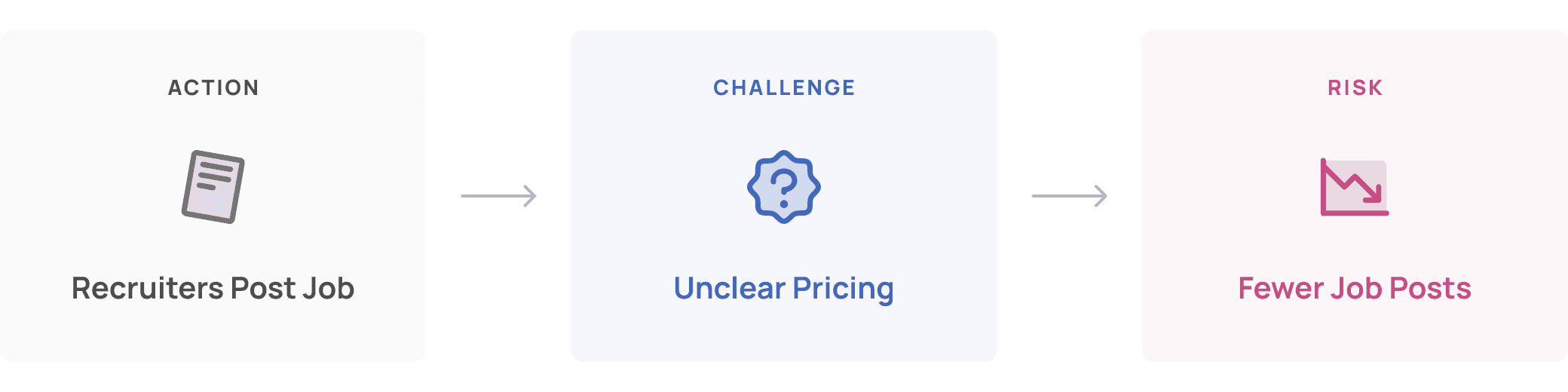 After launching the first model, I led usability testing revealing 43% couldn't distinguish pricing rules. Combined with sales reports of post volume drop, I identified recruiters needed transparent costs to budget and post confidently.